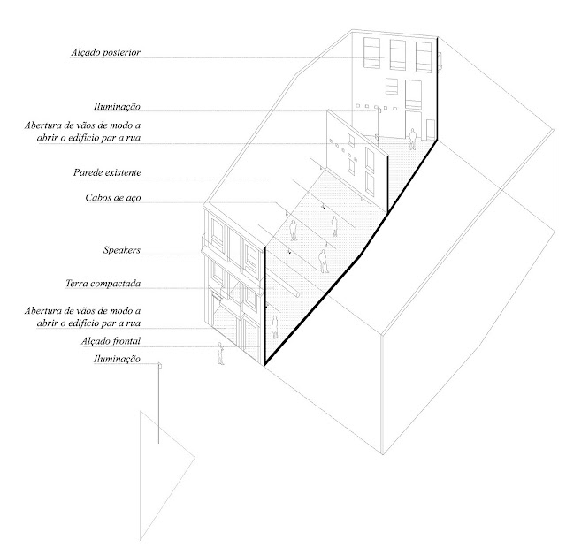 O objecto da instalação configura-se em dois níveis distintos: ao nível do espaço visual e ao nível do espaço sonoro. O espaço visual é constituído pela própria ruína do edifício (alçado frontal e de tardoz, e empenas laterais dos edifícios confinantes) bem como pela marcação do piso térreo, e pela inclusão de uma plano horizontal superior (que contrapõe a verticalidade do conjunto edificado) definido pela marcação linear dos cabos de aço. Estes cabos de aço constituem, igualmente, o meio de suporte dos dispositivos sonoros, os quais estarão suspensos, e estrategicamente dispostos de acordo com um desenho sonoro. Pretende-se ,também, que esta disposição espacial possa sugerir uma possível distribuição formal de um espaço doméstico A componente transformativa do espaço visual e performativo é introduzido por um sistema de iluminação difusa (que só funcionará em período nocturno) que se localiza na parte anterior da ruína ,de modo a definir as silhuetas da edificação, não a iluminando inteiramente. O espaço sonoro é criado através da reprodução de “sets” gravados, que mediante a localização dos dispositivos sonoros, possibilitam distintas percepções espaciais (seja unidireccional, bidireccional ou tridimensional).