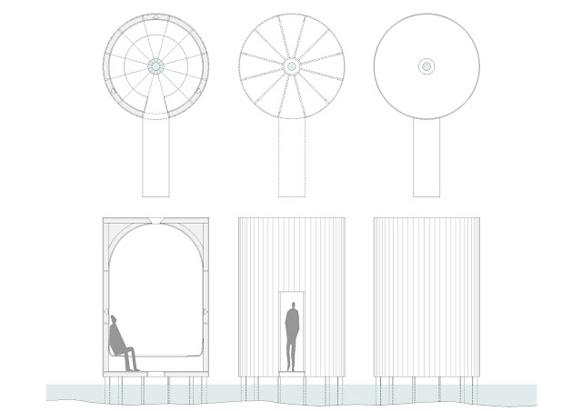 The entry to this building is the first arch of the bridge: as an antechamber, it works as the music’s 1st part, where water is listened to in echo. That water is recorded and reproduced within the cylinder, recreating the soundscape into a factor of living, becoming part of the musical composition.